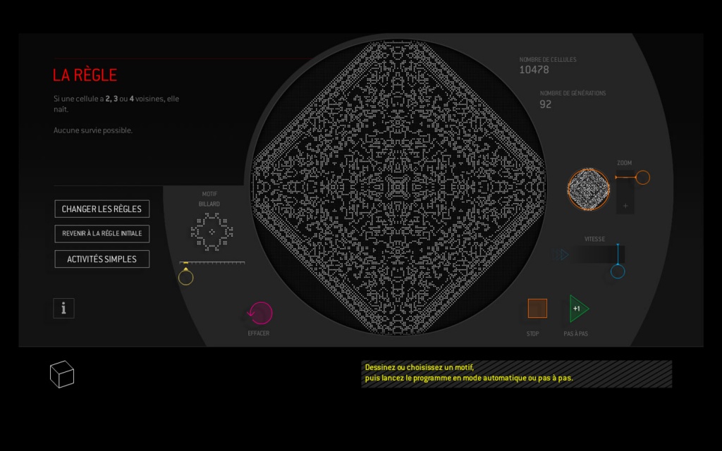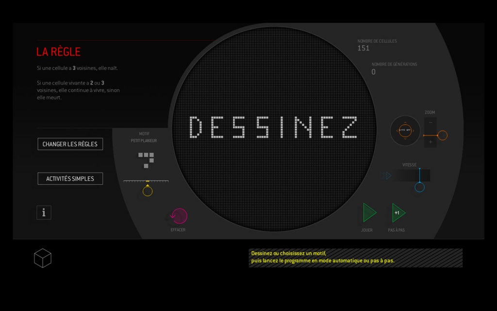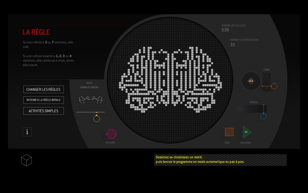 Le jeu de la vie est un automate cellulaire inventé à la fin des années 1960 par John Conway. Il a été remis au goût du jour par nos soins pour l’exposition JEU VIDÉO : fonctionnalités ludiques, interface sexy autour de l’imagerie de la boite de Petri, design sonore tonique, écran tactile.
