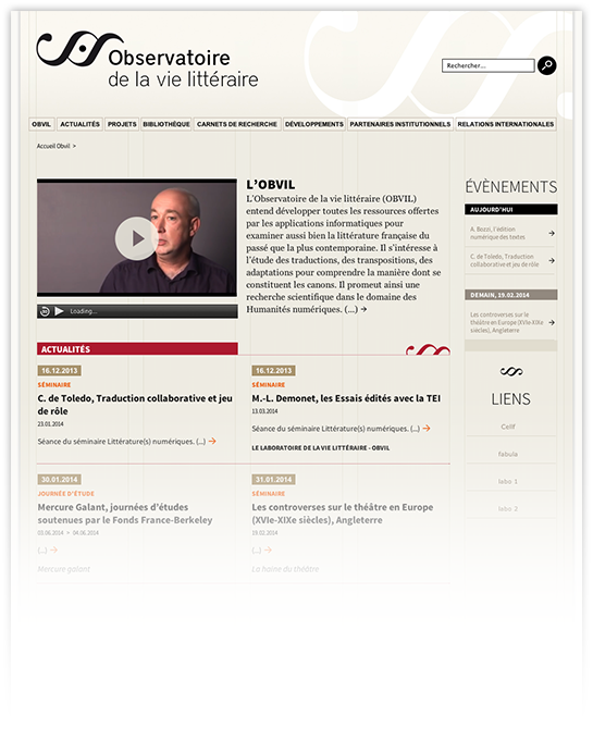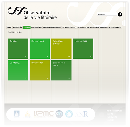 « L’Observatoire de la vie littéraire (OBVIL) entend développer toutes les ressources offertes par les applications informatiques pour examiner aussi bien la littérature française du passé que la plus contemporaine. Il s’intéresse à l’étude des traductions, des transpositions, des adaptations pour comprendre la manière dont se constituent les canons. Il promeut ainsi une recherche scientifique dans le domaine des Humanités numériques.«