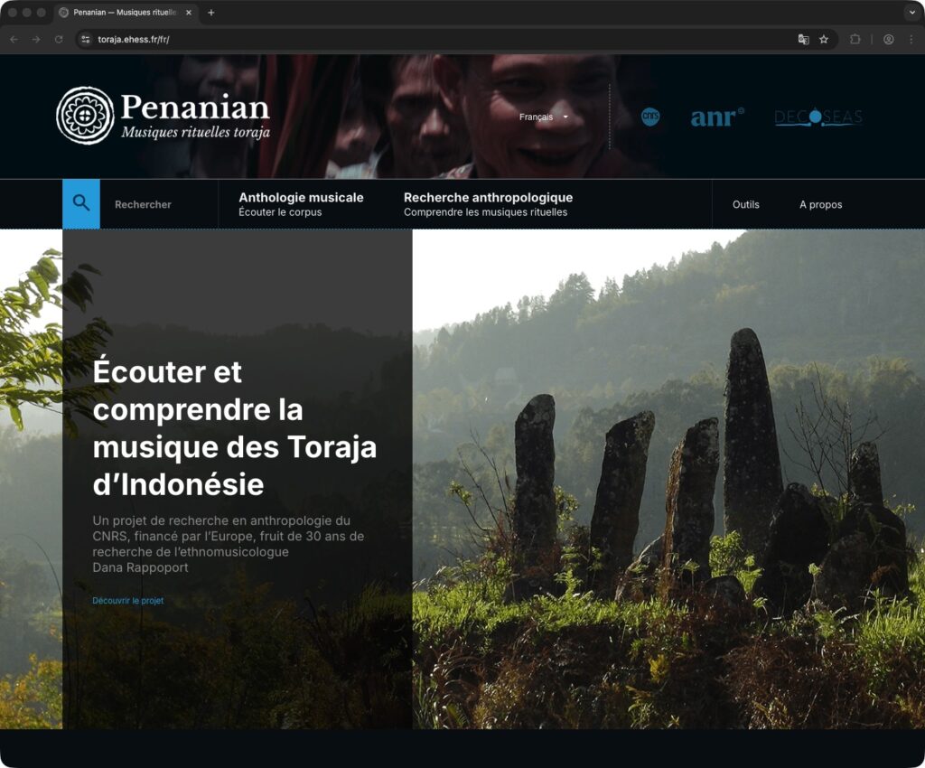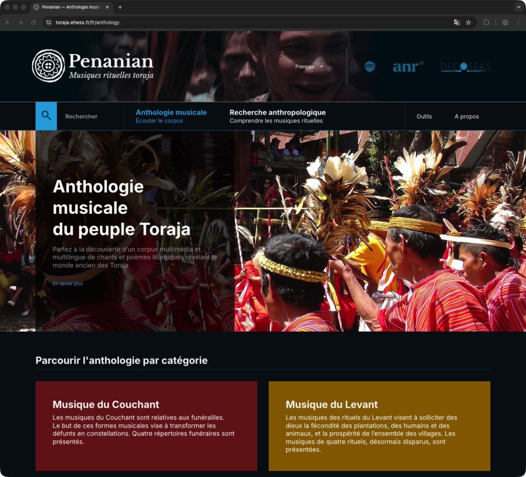 Le site web Penanian. Musiques rituelles toraja (2025) est la version modernisée d’un DVD-ROM publié en 2009 dans le coffret rouge Chants de la terre aux trois sangs. Musiques rituelles des Toraja de l’île de Sulawesi aux éditions de la Maison des Sciences de l’homme/Editions Epistèmes.