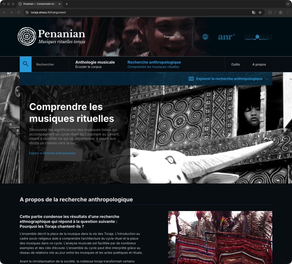 Pionnier dans le domaine de la recherche scientifique, ce projet d’édition électronique constitue une base de connaissance sur les musiques rituelles des Toraja de l’île de Sulawesi (Indonésie), étudiées entre 1991 et 2001 par l’ethnomusicologue française Dana Rappoport (CNRS).