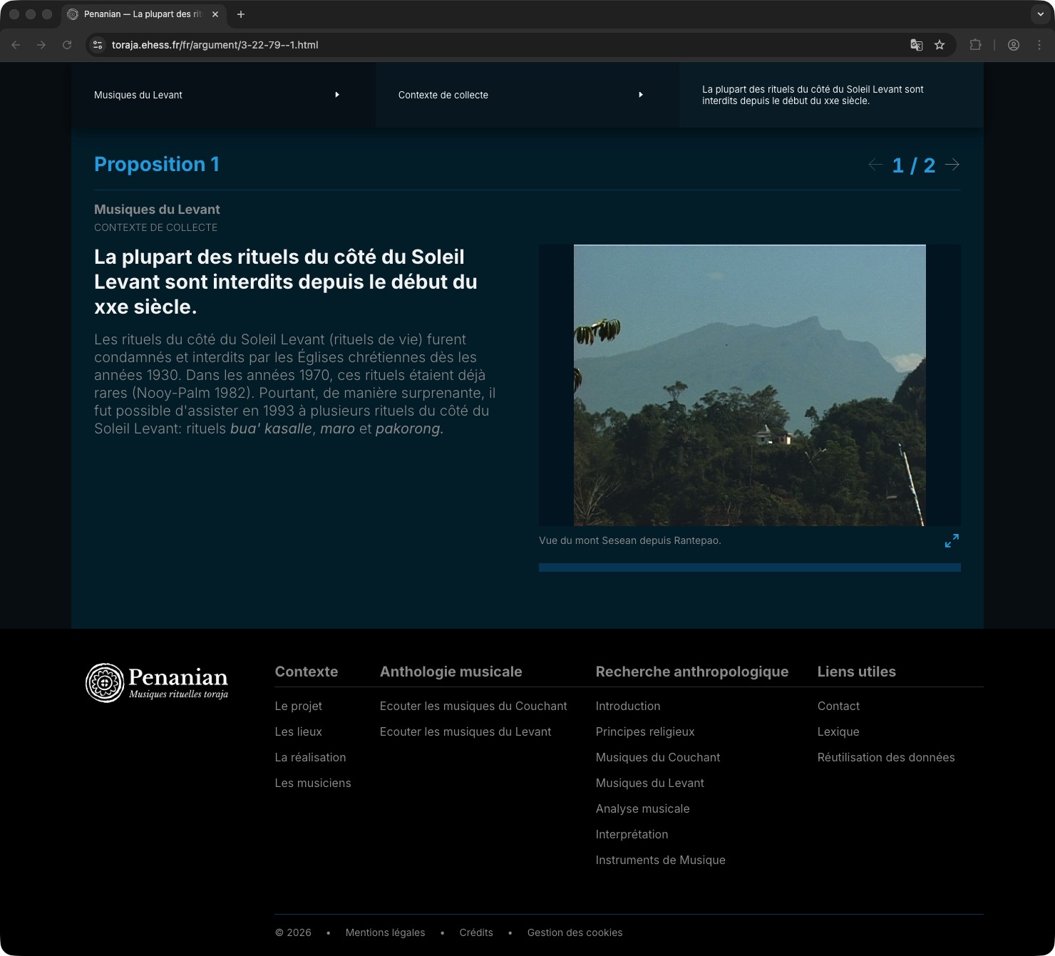 Ce site web rassemble et organise les savoirs relatifs aux musiques toraja, en donnant accès à un ensemble intégré de données sonores, visuelles et textuelles, traduites, annotées et interprétées. Publié en 4 langues dont le Toraja.