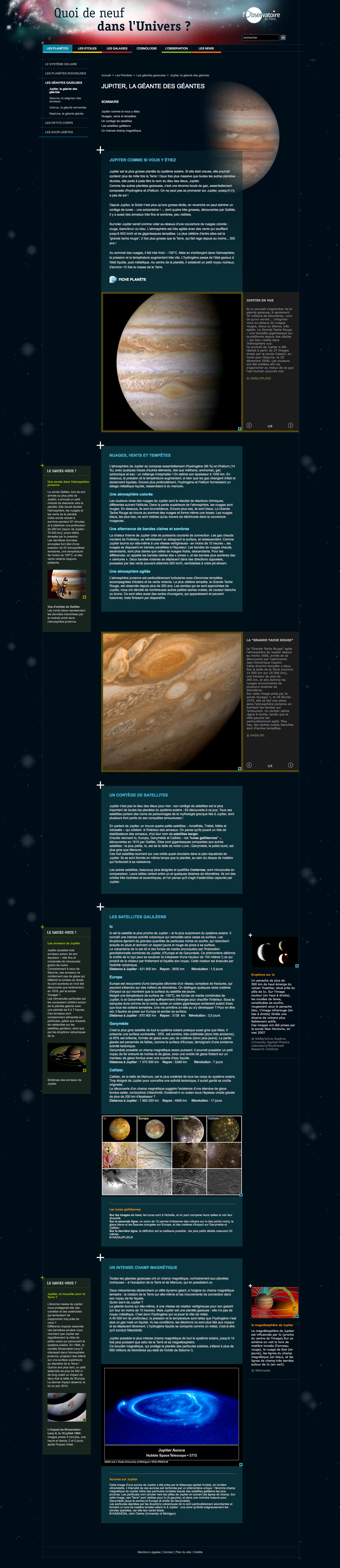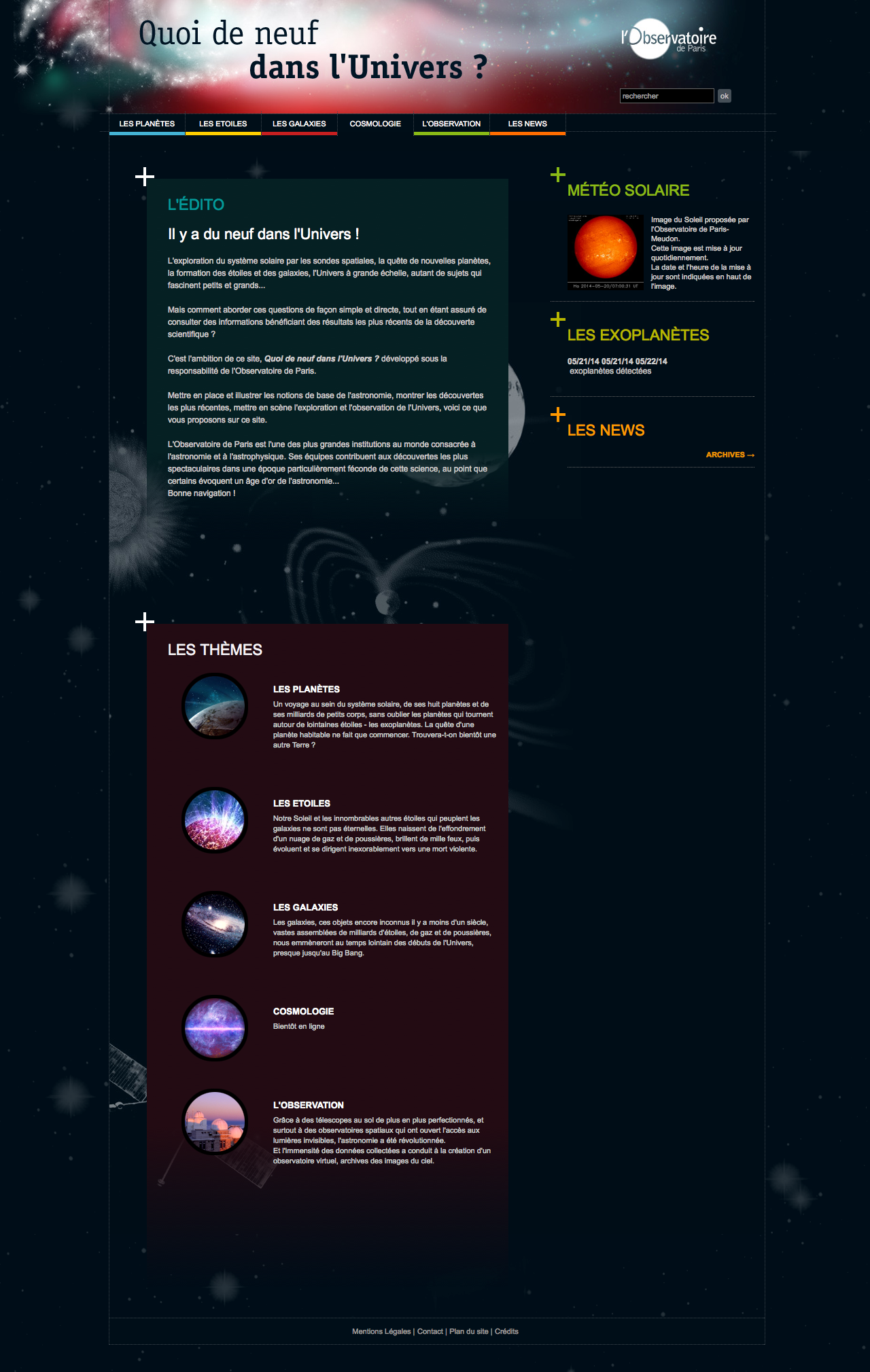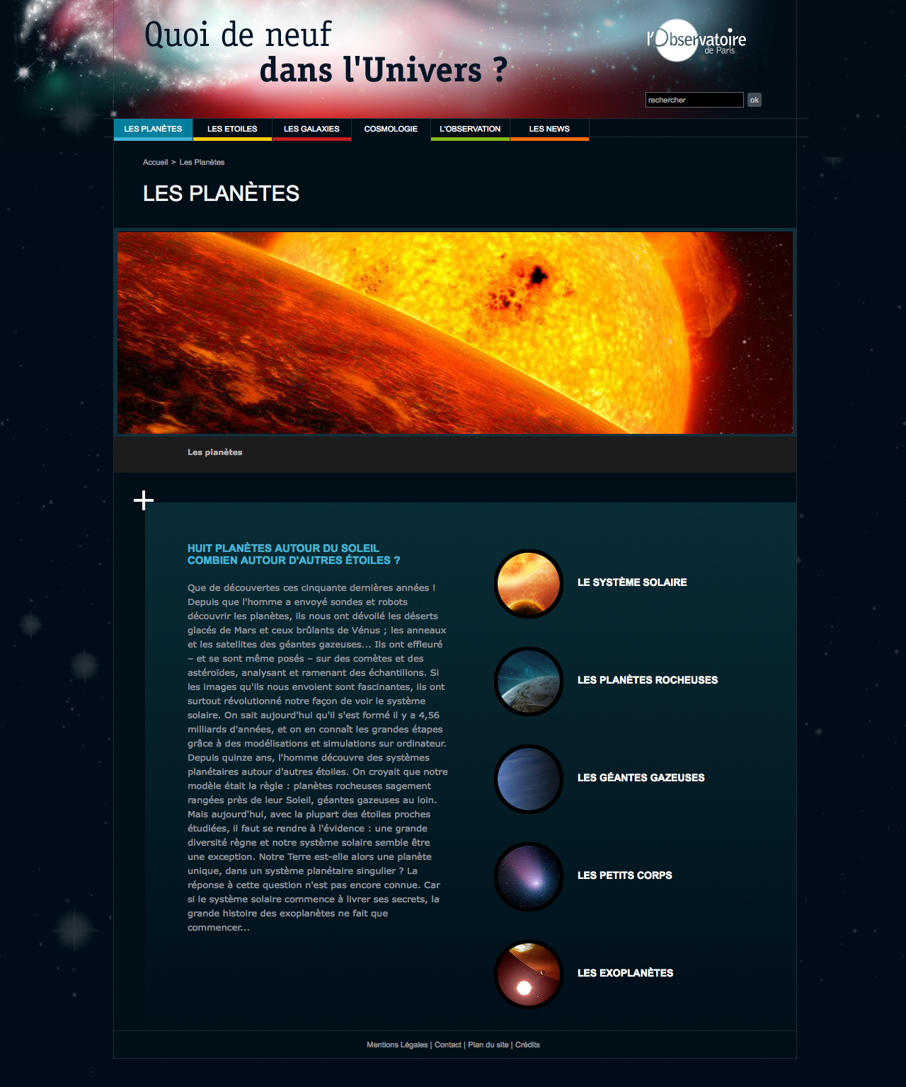 Une commande de l’Observatoire de Paris, c’est un site web qui fait le point sur l’ensemble des connaissances scientifiques concernant l’univers. Un grand volume d’images, des films, des animations, beaucoup d’énergie dépensée pour un site qui n’a hélas jamais vu le jour…